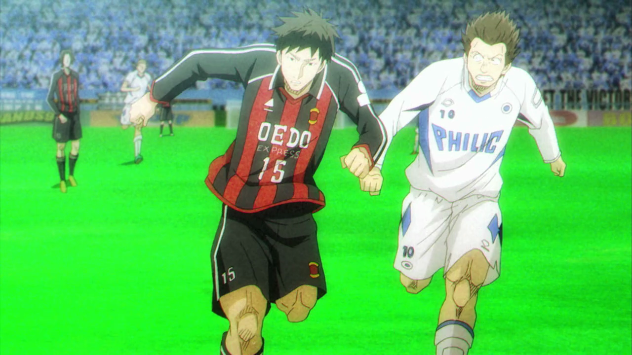 This was a no-nonsense, on-field episode – time continues to glacially pass at slower than real-time. Bar the aforementioned (and well-crafted) flashback scene to Tatsumi’s pre-game talk with Natsu and one cutaway each for the Kids, Skulls, Edomae and owner’s box the entire ep was played out on the pitch. And while the score remained 2-0 at the end of the ep (though not for long, methinks) the direction did a great job of portraying a surprising but feasible gradual shift in the flow of play. ETU is generating chances now – the key being slowing down Kubota and elimination of Osaka’s dreaded “rebound” opportunities. With Tsubaki’s seemingly endless energy and Kubota’s lack of stamina, all of a sudden two or even three ETU goals don’t seem so unrealistic as they did at halftime.