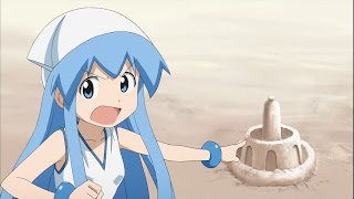 Second, we have a very silly story of sand castles. Ika stumbles upon Takeru and his ostentatious little friend building a castle and decides to do it one better, which leads to a rather bizarre construction Takeru-friend aptly labels a turd. This young fellow appears to be another future arch-enemy for Ika-chan, as she humiliates even his father – a professional sculptor – by secretly using her tentacles to help her turd destroy his spectacular construction. All this played out over a backdrop of Ika’s new talent – those little flaps on the side of her hat. You can buy that hat at Cospa now, but I suspect it can’t do what Ika’s does – slap mosquitoes, slap people, cool off her friends… Everything but fly, apparently, much to her disappointment. Alas even Ika doesn’t know what they’re actually supposed to do – are they fins, or what?