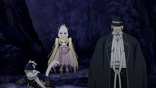 The big news this week was the introduction of two new characters – Garrad and Valentine. Valentine’s an inspector from the head office and a former bee; Garrad his very normal-looking, cigar-chomping dingo. They don’t appear until later in the manga and never in this context, so this was an interesting change. They’re both attention-grabbers, right from the start – gruff, cynical and (in Garrad’s case) loud – they’re like a couple of guys that stepped off the pages of Fullmetal Alchemist. They’re quite unlike anyone else in Tegami Bachi and the contrast totally works. In terms of story, what they offer here is a glimpse inside Reverse – the terrorist (revolutionary?) organization that’s wreaking havoc on Bees and their letters in the South. Via a shindan Valentine even gives Lag a peek at Gauche attending a Reverse meeting as Noir.