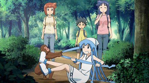 That third act involved the siblings and Ika climbing the local mountain, an act which Ika sees as utterly pointless. But Chizuru isn’t letting her out of it, and the four of them set off up the peak and the stage is set for yet more absurdity. This time, a parade of animals – squirrels, monkey, bear and finally king cobra – king cobra? – assault Ika to munch on her tentacles. That was the most LOL moment of the ep for me, especially when the snake showed up. Seriously – a king cobra in Japan? Poor Ika proved no match for it, alas. She also proved no match for her own echo, engaging in a heated shouting match with it from the top of the peak in another inspired comedic touch and a reminder once again that Ika isn’t like the rest of us just yet.