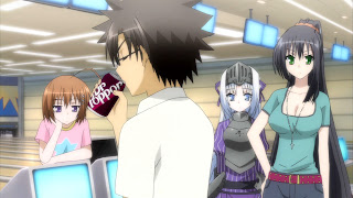 Things started out zany as Haruna had a rather amusing dream about her lost Masou Shoujo powers and battling a pudding, only to be awakened by one of the more bizarre alarm clocks this side of a Dali painting. For most of the episode she, Yuu and Sera are busily engaged in a series of contests to determine who gets the last pudding int he fridge – which should give you an idea of the lighter tone this week. These include Mah Jong, Twister (my favorite) and finally bowling. It’s at the bowling center where they cross paths with Ayumu, accompanying BFF Orito on a sort of pity man-date. Hi-jinks ensue as Ayumu tries with predictable results to keep his new living arrangements secret from Orito while the latter engages in increasingly lewd and preposterous fantasy sequences about the girls while drinking “Dr. Popper”.