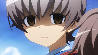 Our major misdirection this week starts off looking like comic relief. Hero Squad parodies seem all the rage lately (Mitsudomoe, Shinryaku Ika Musume, and Level E have all had fun with them within the last year) and Yumekui Merry jumps in with the filming of an episode on the beach, ~degeso. Turns out Yumeji is a big fan of the hero, Sprain, who injures a different body part every time he defeats an enemy. But a bolder fan is the little boy who has Sprain sign his mask. The boy had a muma companion, Delga, who helps him pursue his superhero dreams. But his daydreams are invaded by a muma named Treesea, a nasty girl with overwhelming power. She dispatches Delga rather easily and leaves the boy as the others before him were left, listless and zombie-like with his dreams gone. It would have been impossible not to believe Yumeji and Merry might swoop in to save the day before all this happened, but that didn’t come to pass – an example of the surprising darkness this show is willing to plumb.