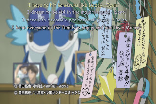 Personally, I would love to see an entire season focused on Goro’s comeback as a batter – I always missed seeing that side of his game during all those seasons devoted to his pitching. But this OVA was a good sampler of it – and it’s poetical in its way, as that was the same course Goro’s Dad Shigeharu took. I love the fact that he was never forgotten in all the events of the story, hovering over them as a loving presence much as Wakaba did in Cross Game. The story is pretty straightforward – after 14 seasons in the Majors Goro’s left shoulder finally gave out, so he enters retirement with Kaoru and their two kids, Daigo and Izumi. Except… GAR-o, hero that he is, isn’t ready to give up – he wants to keep playing, this time in Japan as a fielder. And why not, as he was a spectacular batter as well as a pitcher his entire life. So he starts learning to throw with his still-weak right shoulder and begins training his tail off. But he keeps this a secret from the kids, as he doesn’t want them to see him playing anything less than real baseball. Daigo is a toddler and still in the hero-worship stage, but Izumi is old enough to wonder why Daddy doesn’t work – and why he spends so little time with her.