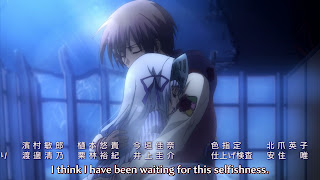 The issue of Ayumu’s status after blowing himself up was kind of a let-down – Haruna and Sera picked up the pieces and put him back together, though he did stubbornly refuse to wake up for a while. The real drama here was what came after – the confrontation with KotN and the resulting surprise. Sera had a chance to shine, being forgiven by her clan because she was the only one who could close the gates of the underworld KotN had opened to unleash his mega-megalo. Haruna got her masou shoujo mojo back after calling Dai-sensei for help. But it was really all about Ayumu and Yuu. My favorite part of the episode was when she made him turn away as she took KotN’s life at last – it says so much about her. In keeping with the morose tone of the show all she could promise him was “you’ll be unhappy” – but as long as it was with her, Ayumu could live with that. And yes, she did promise – Yuu has voice outside Ayumu’s fantasy at last, and as far as I can see it’s unknown (to me) 20 year-old seiyuu Midori Tsukimiya. I’m not quite sure how this works, as her very voice was supposed to carry the power of death – but she was blabbing away pretty good there by the end.