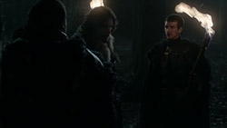 As stated, the real meat of the episode was dedicated to moving the pieces in place for next season. Joffrey is an increasingly psychotic little prick, and Ceresi seems to have taken up with a boy-toy cousin. Sansa is still to be wed to Joffrey, and had certainly lost any illusions she once has about his character. Arya in under the protection of Yoren of the Night’s Watch, posing as a boy and heading North with his caravan of rapists and thieves (and Robert’s bastard, the smith’s apprentice Gendry) headed for the wall. Jaime is prisoner of Robb’s army, bloodied but unbowed. He admits to having pushed Bran from the window, and the Stark’s bannermen seem to have decided they’d like to have a Kingdom of the North under Robb’s leadership rather than throw their lot in with either of Robert’s brothers. And Bran and Rickon have just received news of Eddard’s death, having dreamed of it the night before.