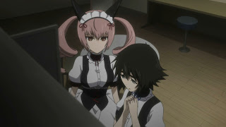 As ugly as things are getting, there was still time for a little humor – most of it, as usual, coming from the banter between Okarin and Christina. He catches her on the phone at the beginning, crying over something and having a heated conversation – but she won’t way with who or what about. Meanwhile we also learn that she’s a 2channer – do the secrets never end with this girl? Daru and Mayushi both her their relationship figured out, at least – she and Okarin are hot for each other, big-time.