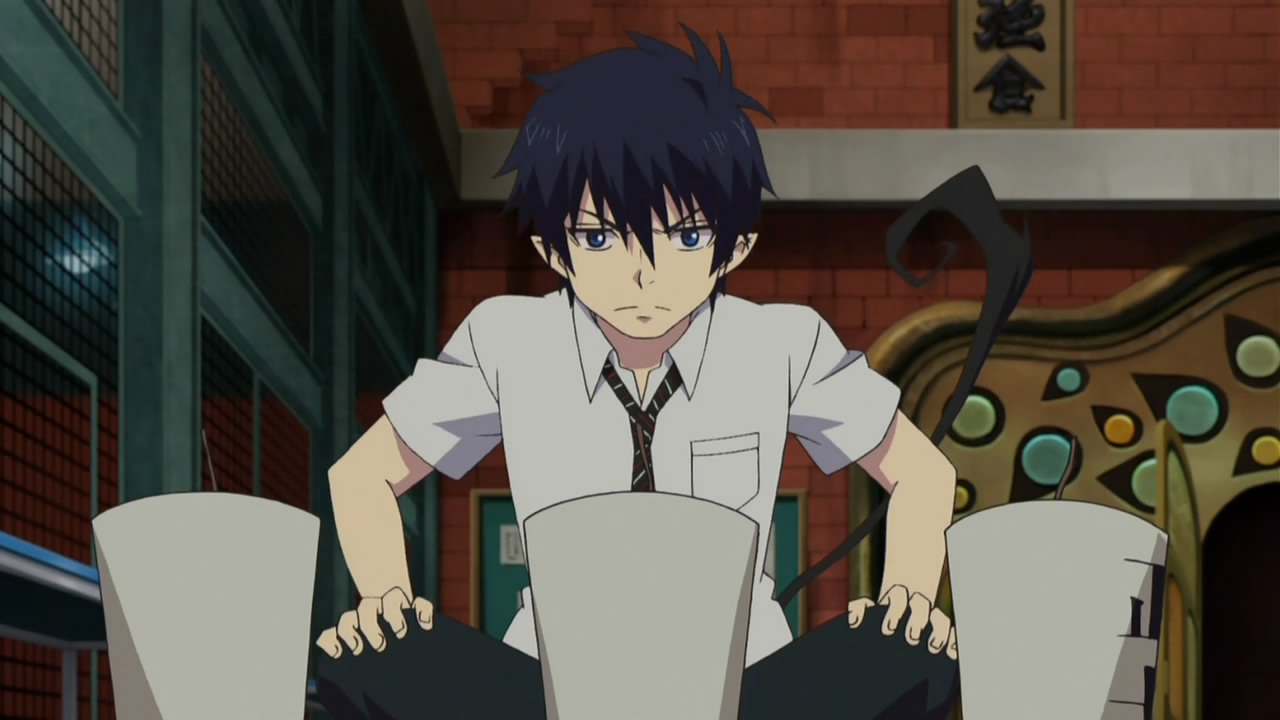 The thing is, the scenes at the school were very good I thought – right in the sweet spot of what this series does well. Absent the developments that preceded it I thought the classroom scene did an excellent job illustrating how conflicted Bon and Konekomaru felt about Rin and what he was, and it felt very true to me that Izumo – being a natural outsider herself – would be the least judgmental of the group. I enjoyed the interaction between Rin, Yukio and Shura in the “batting cage”, and Shura’s treatment of Rin felt very true to her character. Rin has a very real problem, and the training Shura devised makes sense, though I suspect no one has any real idea of just exactly what control Rin has over his powers. His “cleansing” of Shiemi (not to mention the interesting results with Shura and Yukio) being a perfect example – Konekomaru and Bon being horrified based on the Blue Night, but Shiemi was completely unharmed and didn’t even feel warm. Just how, exactly, do these flames interact with Rin’s emotional state? No doubt Shura is correct that it’s his fear that prevents Rin from controlling himself, but even when he was afraid for Shiemi he still expressed control over the flames.