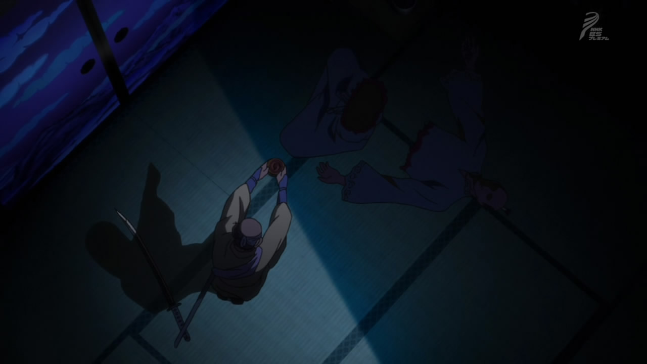 Even by this show’s standards the events following the murder and the destruction of Honno-ji aren’t going to inspire a lot of faith in human nature. Sosuke and Oda’s brother – still dressed as a woman – dig through the rubble of Honnio-ji looking for Nobunaga’s masterpieces, and only Sosuke deigns to go through the motions of grief. When Nobunaga’s bodyguard Yasuke arrives (just in time to save the pair from Akechi’s men) he offers them a bushel of treasures, and both men’s eyes light up in orgiastic joy at the prospect. There’s so much subtlety in this show, and as much as with any anime I feel strongly that there are elements I simply don’t fully grasp by nature of not being Japanese. But it seems to me that a comment is being made here about the nature of the aesthete and the nature of the warrior, and how our perceptions of who might be the crueler of heart might be misguided. No one’s hands are clean in this affair – ironically, it’s probably Akechi whose motives are the most idealistic, even as he sets off to commit treason and murder.
