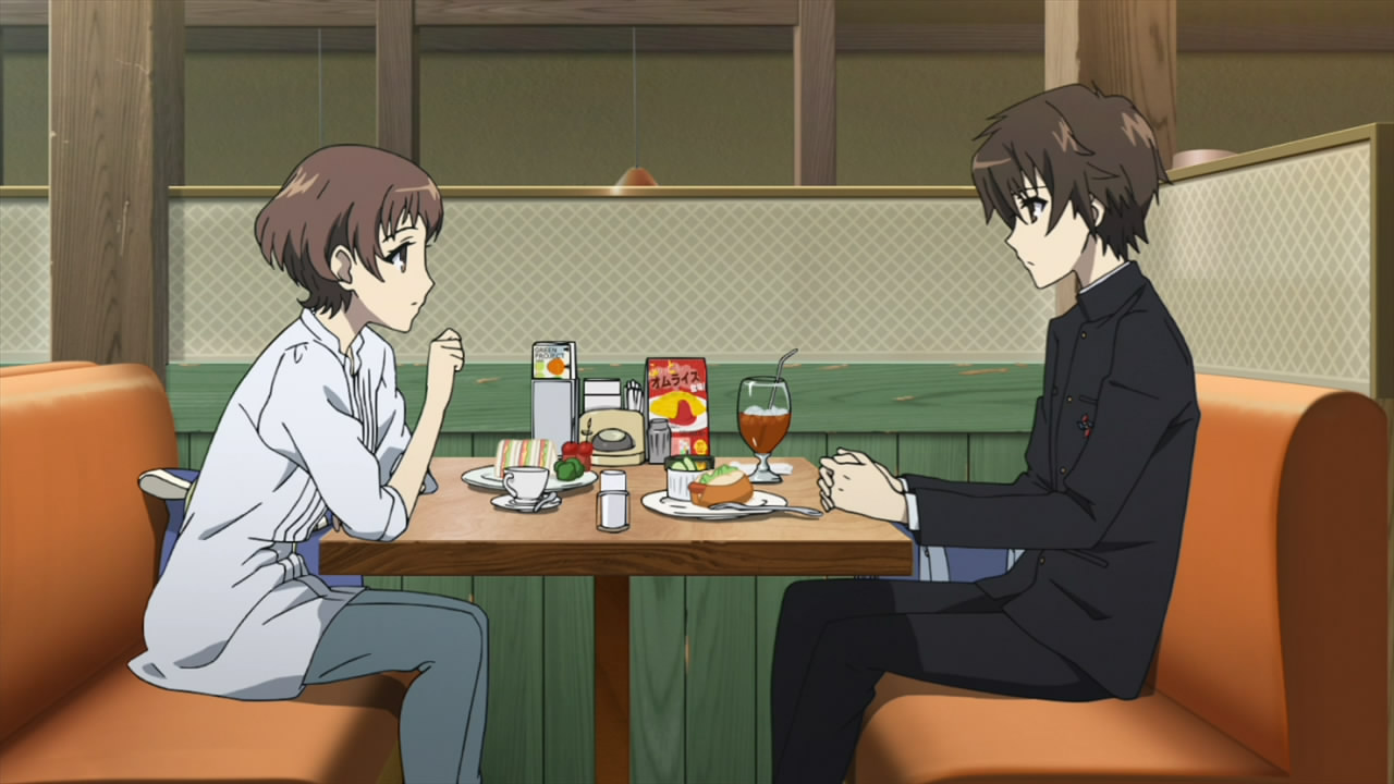 It can’t come as a huge surprise to anyone that Sanae would be the next to die, as she’s been sending up death flags from day one (“Let’s be careful!”) – but what a way to go (remind me not to watch the Blu-ray versions of this anime – or at least the last minute of the episodes). Too bad, I liked her – and I thought there might be a little romance building between her and Kou, as she certainly seemed to have a taste for cherry pie. The question is, what’s the implication of her death? We know that the supposed “curse” can impact family members and other close connections to Class 3’s students, and that Sanae’s brother is in the class. But there are two other distinct possibilities I can see – it could be the direct connection to Kouichi that’s the fatal trigger (Sakuragi saw him just before she died, and Sanae was talking to him on the phone) or the acknowledgement of Mei’s existence (Sakuragi saw her, Sanae was talking about her). Does Sanae’s death invalidate the theory that the ED predicts the death order? Not necessarily – as the ED is all students, and could still prove to to be predictive in that subset. A few other notes: