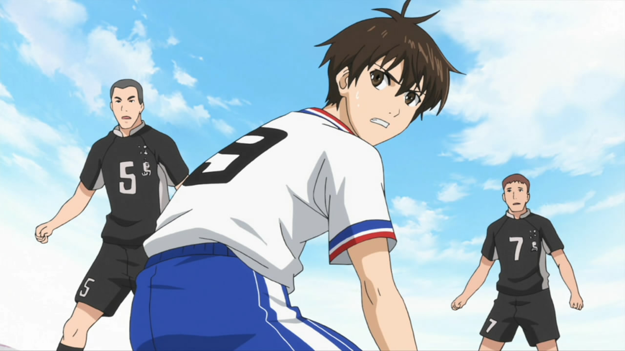 This ep was titled “Conclusion” and while it opened many new plotlines, it did wrap up the events of last week pretty thoroughly. Kakeru’s bicycle kick died on the goal line, the ref blew his whistle and the match ended in a tie. Rather than a replay or PKs, Coach Kondou of the SC decided that he would resign as coach, and allow Iwaki to take over a joint SC/FC team to represent Enoshima High. He did this to make amends for not supporting Iwaki when the FC almost won the championship several years earlier, but this was all a bit too convenient for me – indeed, Iwaki and Kondou spent most of the ep telling each other how great they were. What can’t be denied is that there’s seemingly enough talent on the combined squad to do some serious damage, and the SC was only able to stall the FC charge by abandoning Kondou’s tactics – so kudos to him for recognizing that, I suppose.