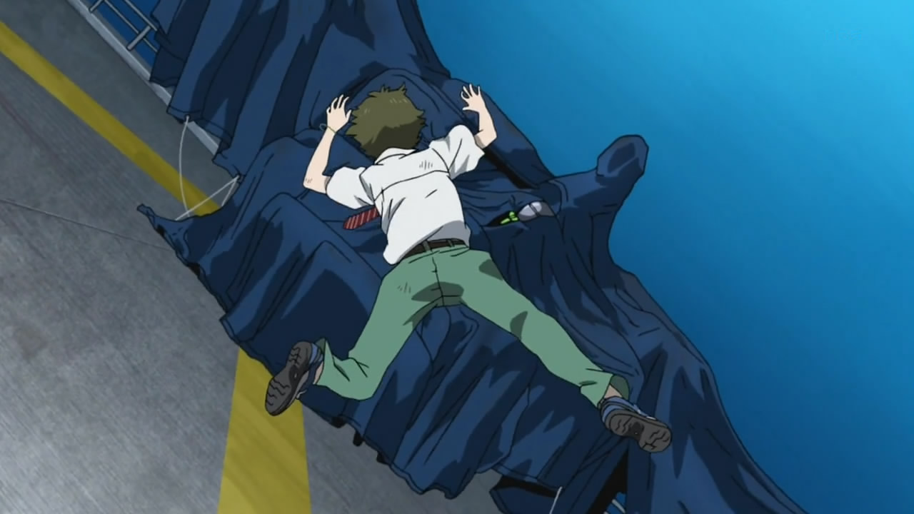 I can’t imagine any fan of Eureka Seven not getting a thrill out of Ao jumping into the cockpit of the Nirvash (known as the “Mark One” to the denizens of this world) and surfing the trapar into battle with The Secret – and kicking its ass. That was pure E7 gold, thrilling to watch in glorious traditional animation as Nakamura Koji’s jackhammer musical score rose up in the background. All of the big set pieces were beautifully animated, fully in the tradition of E7 but looking even better. Equally impressive though, both in terms of direction and acting, was when the focus narrowed down to Ao, hiding his newly turquoise hair under a baseball cap and in hiding himself. Only Naru knew where to look, and Ao was prepared to have her recoil in disgust like the other Okinawans had done, and his relief when she embraced him was a really strong emotional payoff after only two episodes. I don’t know who “Takeyoshi Kakuto” is – a real newbie writer, Satou Dai or Kyouda Tomoki undercover – but he’s got some serious writing chops on display so far.