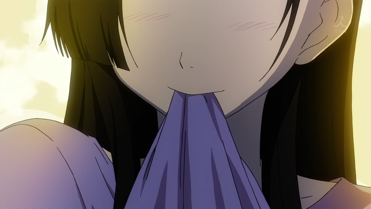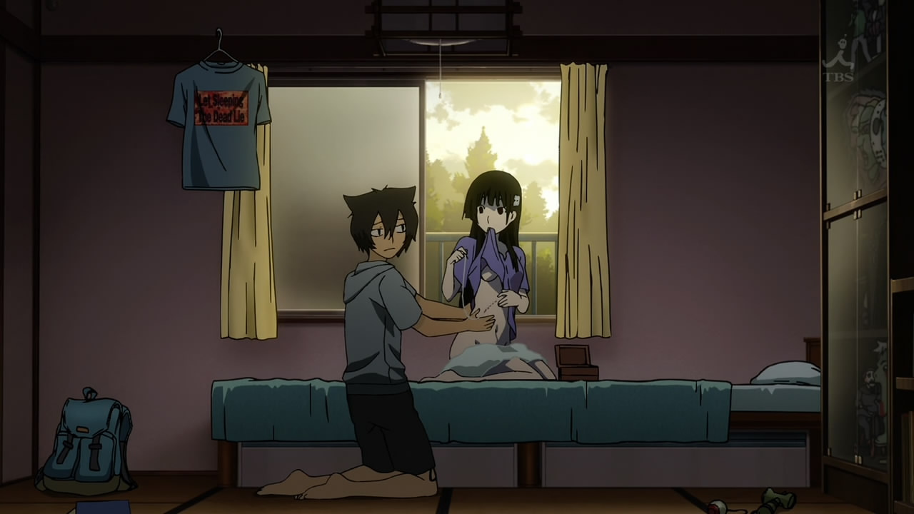 Mostly though, the issue is that every time I feel as if I’m close to getting at what this show is really about, it completely changes course and leaves me in the dust. There were some moments this week that were as close to the kawaii factor of Denpa Onna – which probably sets the modern standard for adolescent cuteness in recent anime – as I’ve seen. But many of those moments involved a girl who’d just died a horrible death, escaping her abusive and demented father by getting her intestines ripped out of her body falling from a cliff. Then there are the supporting cast – Wanko, who’s exploited for fanservice at every moment. Mero, a sort of classic snarky imouto who’s being played by Iguchi Yuka as an exact vocal clone of Chihara Minori’s Chiaki from Minami-ke. Grandpa, an over-the-top slapstick ojii-san (who may be a zombie himself, as he eats hydrangea leaves). And Chihiro’s two friends – the oversexed and obnoxious Yasutaka, who plays like a reject from a bad 90’s school romance, and the absurdly feminine Mogi, who I’m really beginning to think might be a trap because really, could that actually be a guy in high school?