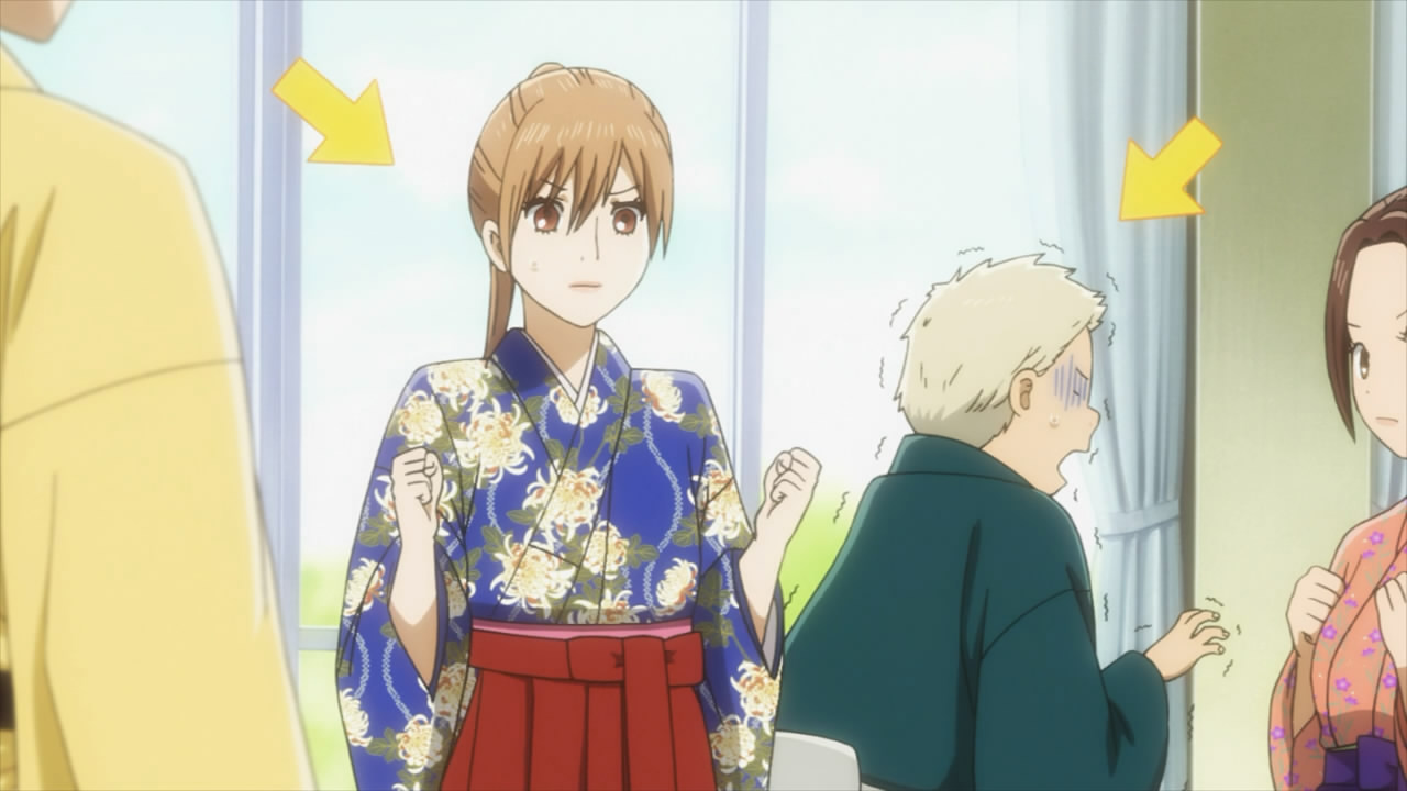 Another thing Chihayafuru has always excelled at is making the opponents interesting – in every case, pretty much – and likeable in most. We knew a couple of these Hokuo players from the first season, of course, but the graduation of Sudou has clearly changed a lot. It was surprising at first to see Hokuo’s resident shota, Amakasu-kun, as Captain – but as their top returning player I suppose it makes sense. Before last week we last saw him being liquefied by Shinobu in Nationals, but this was the first time we’ve really had the chance to see him grow as a character. He seems like a path of least resistance sort of kid (we’ve seen a lot of those among the Class A players in this series), not wanting to push himself or work too hard, though much of that seems to come from a fear that he’s not good enough to compete with the real powerhouses of Class A (including Harada-sensei, in his mind). With both teams assured of a place in the Nationals there’s not as much pressure as there would have been and Amakasu seems content to build a strategy around Retro-kun’s predictions for the pairings, leading to an easy 3 wins over “Glasses Boy, Boobie Girl and Mashima”, but Retro’s pride and the arrival of his “secret weapon” seem to spark Amakasu’s competitive fires quite a bit.