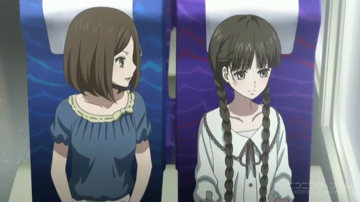 I suppose the best metaphor for that were the scenes on the Shinkansen, carrying Izumiko, Miyuki and the Souda siblings to their family home near Nagano for a stop on the way to a Seitokai Executive Committee retreat.  Even as the train sped along at 300 KM/H Izumiko and Mayura calmly made what seemed like small talk while Miyuki and Manatsu dozed.  There’s a truly wonderful moment when Mayura begins to tell Izumiko about her brother Masumi’s death just as the bullet train enters a tunnel, and the bright sunshine and trees disappear as the exterior of the train is shrouded in darkness and all that’s visible is the reflection of the characters in the window glass.  In addition to the symbolic accuracy, anyone who’s been on a high-speed train will appreciate just how perfectly the scene captures that moment, right down to the way the sound of the train seems to bend as it enters the tunnel.