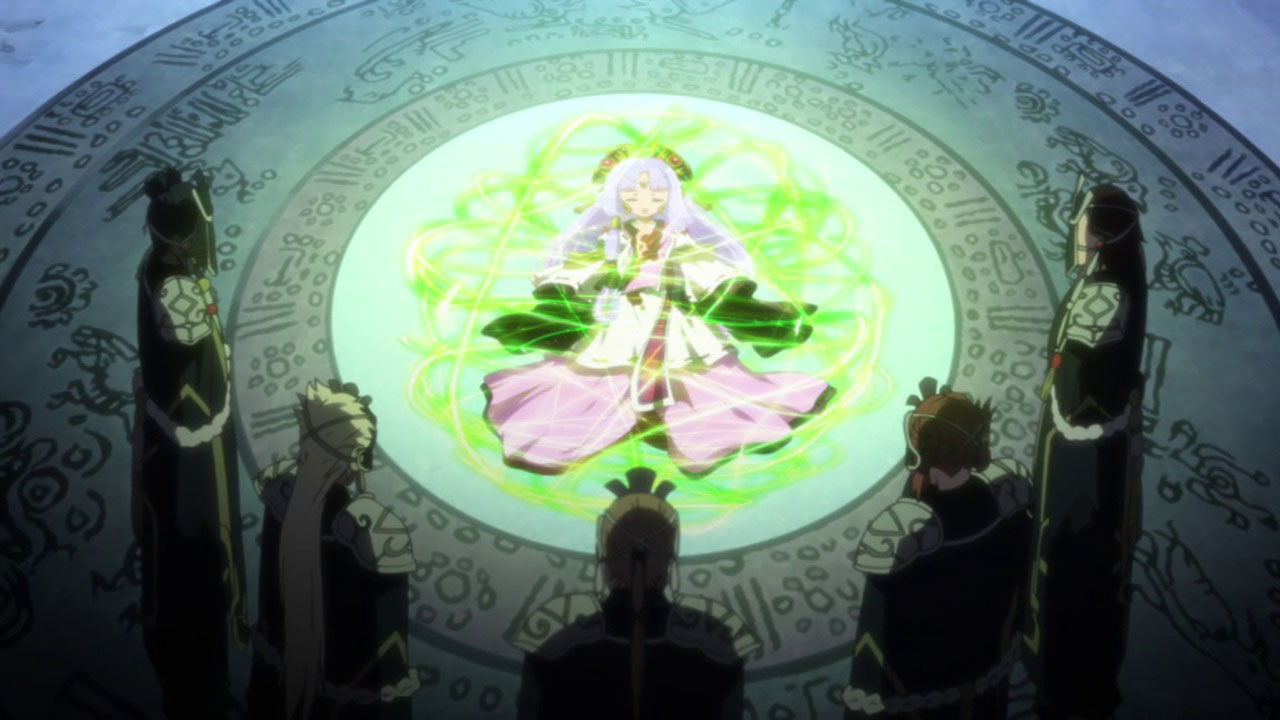 There are other characters who, like Kadowaki, we’ve seen before, but not really been introduced to – until this week. The Six Sho are mysterious, masked members of the Twelve Shinshou – not even Kannagi has seen their faces – and they’re the ones who decide to use Kadowaki’s hatred as their path to gaining control of Amawakuni (which they realize cannot happen until they’ve defeated Arata). One of their members, Harunawa (Akira Ishida, still one of the busiest guys in anime) enters the Kando Forest and switches places with Kadowaki, where the other five await him. There they give him a brief primer on what’s happening, but all Kadowaki really wants to know is that his task is to destroy Hinohara – nothing else really matters. That involves taming the evil Hayagami Orochi, a task which many before Kadowaki have attempted, only to be consumed.