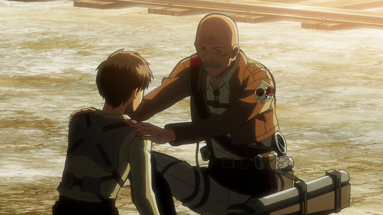 The problem for me is this repeated cycle of people coming to life-changing decisions, only to be persuaded by a couple sentences worth of argument to the contrary. As soon as Pixis said “I’ll pardon anyone who leaves” half the garrison would have been out the door, rather than the 100% conversion rate we saw. Patriotism is fine, but when staring the immediacy of a hideous death in the face, it takes more than a few pretty words to win over every single person in the audience. As always with Shingeki no Kyojin, the premise itself outstrips the execution of it – the problem lies entirely with the behavior of the characters, not the story itself. Of course the status quo can’t possibly work for humanity, and Pixis – whatever else he knows – indisputably knows that.