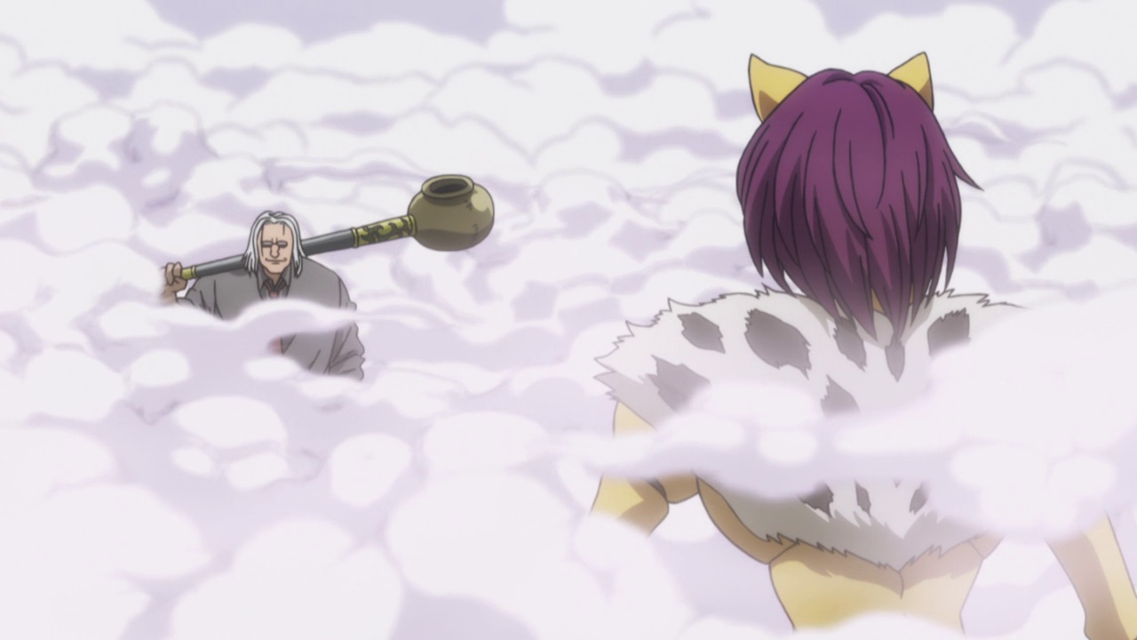 This episode was impressive in its scope, too, covering an astonishing range of plot without feeling rushed or overwhelming. For starters there was the showdown between Knuckle, Morel and Cheethu – in which we learned at the very least that whatever human gave Cheethu part of their DNA liked baseball. This was a pretty splendid battle, beautifully choreographed and animated, as each said felt the other out and sparred verbally as much as physically. The turning point, as you’d expect, when was Knuckle managed to use Morel’s smokescreen and Gyo trickery to attach Potclean to Cheethu – it’s really almost an unfair attack in a way, so effective it is against those who don’t know about it. His first taste of a Nen greater than his own definitely throws Cheethu off his game – it completely unnerves him, in fact – but his speed still presents a real challenge for Morel and Knuckle, and Cheethu’s fate is left somewhat surprisingly for another day. The beast has been tagged, and now its movements can be tracked.