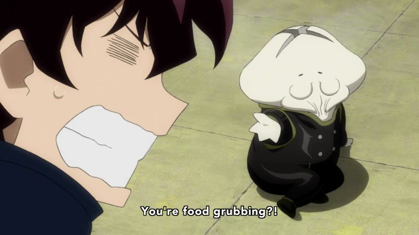 This week’s tale was built around the aforementioned Nej – Amagranoff Luozontam Ouv Lee Nej (Ohtani Ikue). He’s a mushroom (I wasn’t sure at first) who has a serious jones for burgers – burgers from Jack & Rockets, one of the last burger joints left in Midtown and an amalgam of Johnny Rockets and Jack in the box. It’s as he’s rushing after Leo to try and bum a bite that he’s run over by a truck driven by a couple of lowlifes played by Kaji Yuuki and Shioya Kouzou. Being a mushroom he’s fine, but Leo being Leo he springs to the little shroom’s defense, Eventually Nej gets the drivers’ half-eaten burger and all seems settled, but things get kind of dark after that.