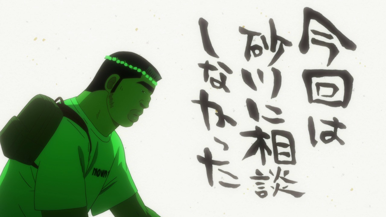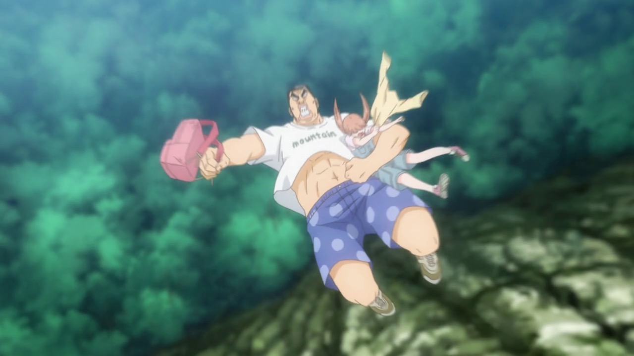 The premise this time around is a picnic for Rinko and Takeo – a make-up game for their deferred birthday date. Except Takeo didn’t consult with Suna this time, and what he ends up taking Rinko on is much more a hike than a picnic. She bears up well on their mountain climb, though she’s packed so much food and supplies that Takeo eventually has to commandeer her cute pink backpack. But a run-in with a jewel-obsessed crow leads to one of the most preposterous of Takeo’s superhuman feats – running down a sheer mountain face, than overpowering gravity itself.