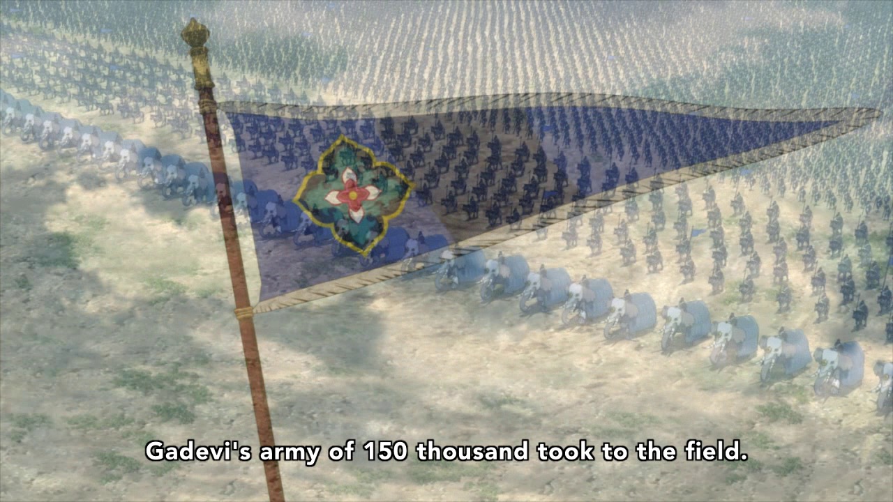 It looks like we’re going to get the latter at least, so that’s a start. But for now, Arslan Senki goes big – in more ways than one. We’re faced with a familiar scenario on the battlefield – Narsus faced with an overwhelming numerical disadvantage, and not at all nonplussed by it. Gadevi has 150,000 men, and an indeterminate number of drug-crazed elephants (it looks to be more than Hannibal’s 38, anyway). Rajendra has 50,000, and Pars only 10,000 – which makes the fact that the Pars and Rajendra forces surround Gadevi’s army largely irrelevant.