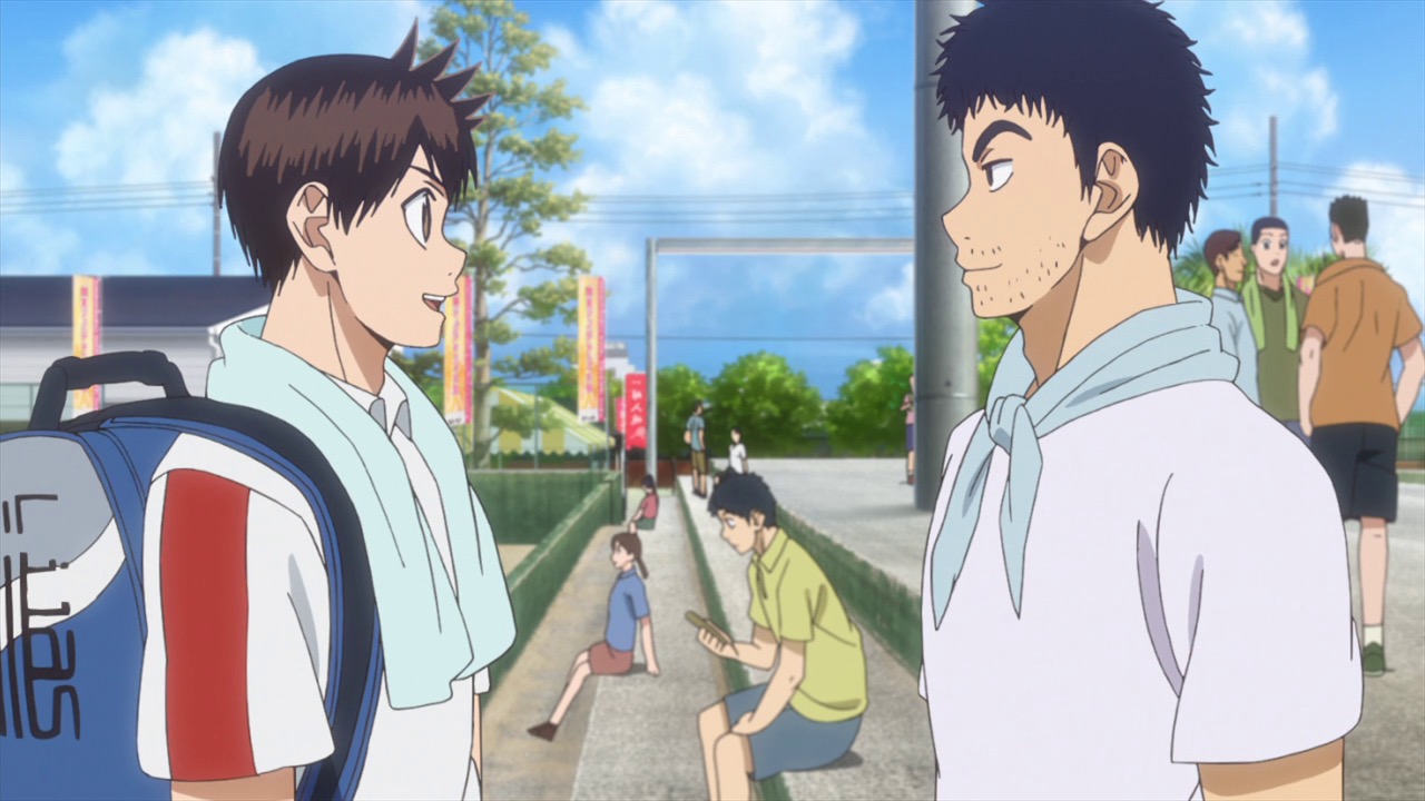On the opposite end of tennis’ career spectrum is Maruo, half Roger’s age and fighting just for the opportunity to be a pro. Before that quest begins, though, there’s the morning after the night before to deal with, and Nat-chan wastes no time in sharing the news that she and Ei-chan are now a couple. Some have the understandable, “What – you mean you haven’t been one all along?” reaction, but for others the official announcement is a fairly big deal – especially given the timing.