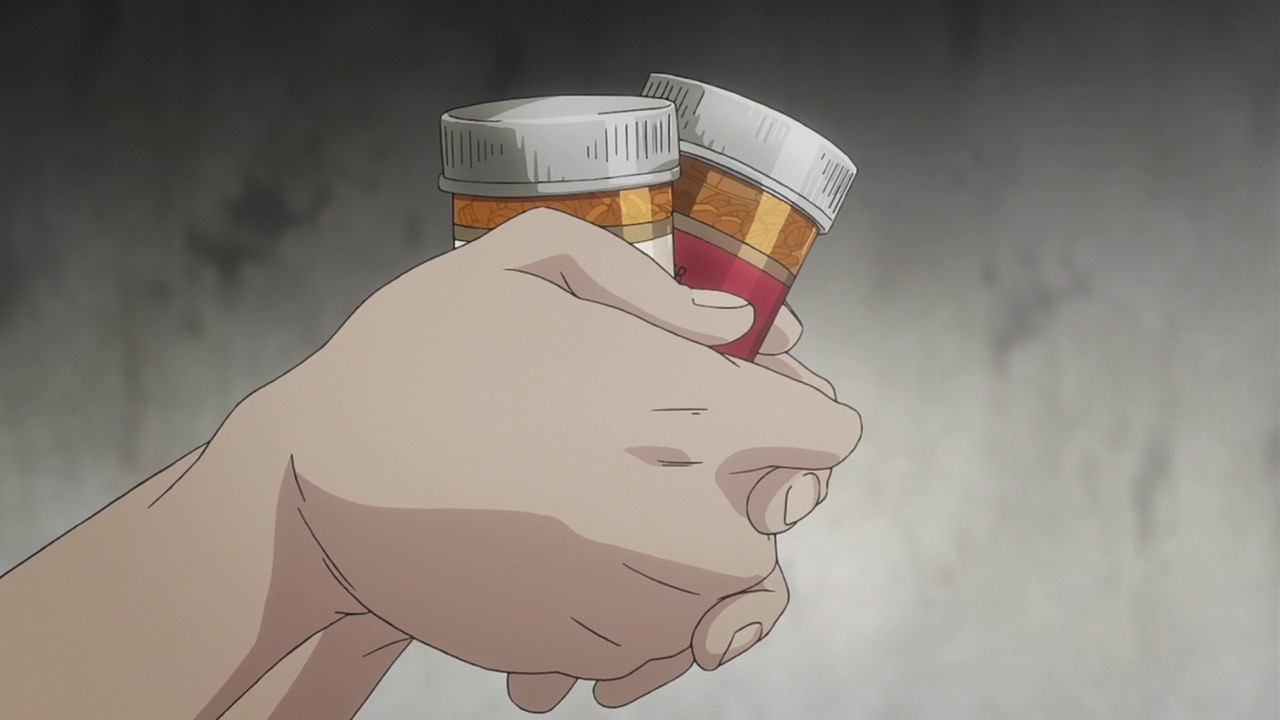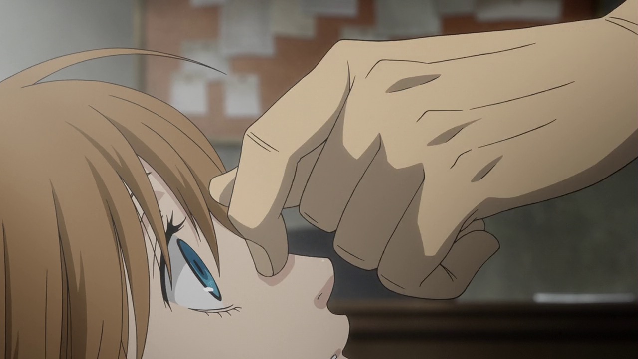 In battle, Nic once again shows himself a badass of the highest order. The dogtag he fights at Theo’s office is a “B-2”, obviously someone very powerful, but not a match for Nic (who’s an “A-O”) – who allows the match to extend for three minutes only because he wants to play. This is harsh stuff, and reveals that Nic is much to be feared, and every time he finally speaks and Tsuda Kenjirou works his magic is a gripping and powerful one. And in the aftermath of the battle, Worick reveals that the fallen dogtag will be “another of Dr, Theo’s experiments” – further evidence that what goes on at the clinic has a very dark side of its own. And just why did he hand Alex a seemingly blank square of paper?