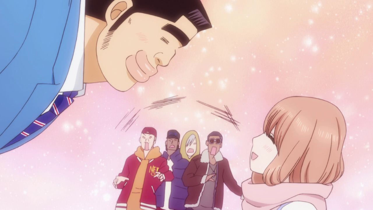 It can be frustrating to watch this all play out the Christmas party, no doubt – but for me, it’s the most realistic depiction of teen courtship we’ve seen in Ore Monogatari so far. Part of that is because it’s intentionally not trying for realism with Rinko and Takeo, but mostly it’s because that’s just how most 10th-grade couples start out. I had no problem with Nanako finally going on “tilt” and bailing after one-too-many ham-fisted non-confessions by Osamu, nor with Osamu turning to Takeo to help after three sleazy dudes put the moves on Nanako and Rinko in the corridor. But it does leave things in rather an awkward place, and Takeo and Rinko wondering what the right thing to do is. “Be like Suna” is the answer they come up with, and it’s not a bad one – though in the end, Takeo can’t resist direct involvement. It’s just his way.