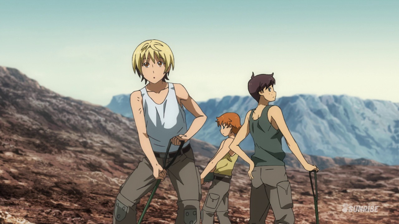 Okada and Nagai have 25 episodes to work with (that was announced today) which should be ample time to flesh out this story of the iron-blooded orphans at the heart of the story, and the conflict they’re caught up in. The major players appear to be the quietly GAR Augus Mikazuki (Kawanishi Kengo) – the one who pilots the Gundam this week – and his best friend Itsuka Orga (Hosoya Yoshimasa). There’s also the requisite chubby mechanical genius Biscuit Griffon (Hanae Natsuki) – seriously Tomino, where do you come up with these names? – among others. Critically, there’s also Kudelia Aina Bernstein (Terasaki Yuka), the MacGuffin and catalyst for now. She’s the daughter of the president of the Mars colony (Kinoshita Haruyuki), and she’s hand-picked four boys from the Third Squad of abused orphans to escort her to Earth to mediate a peace conference.
