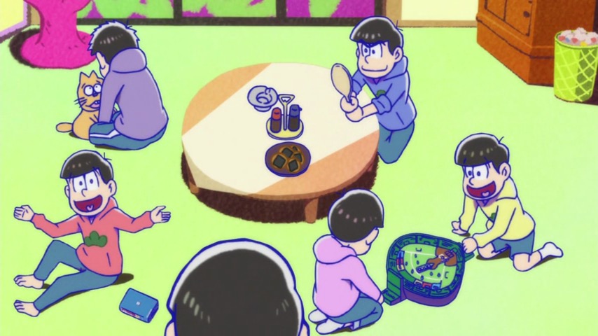That whole interview sequence… Boy, that was a dark ride. A mother making her six pathetic adult sons humiliate themselves to try and convince her to take care of them? It’s certainly funny (I loved the gag with the dirt at Koushien Stadium – taking home a capful of dirt is a tradition for high school baseball boys who make it to Koushien) but it’s one of those comic sketches that feels more and more like a tragedy the more you think about it. The comic peak? When Okaa-san asks her sons which one was the horniest – the drive for grandkids is a powerful thing. And it ends with a spoof of the NPB draft – with both parents wanting Choromatsu, who seems to offer the best chance of actually getting a woman to sleep with him.