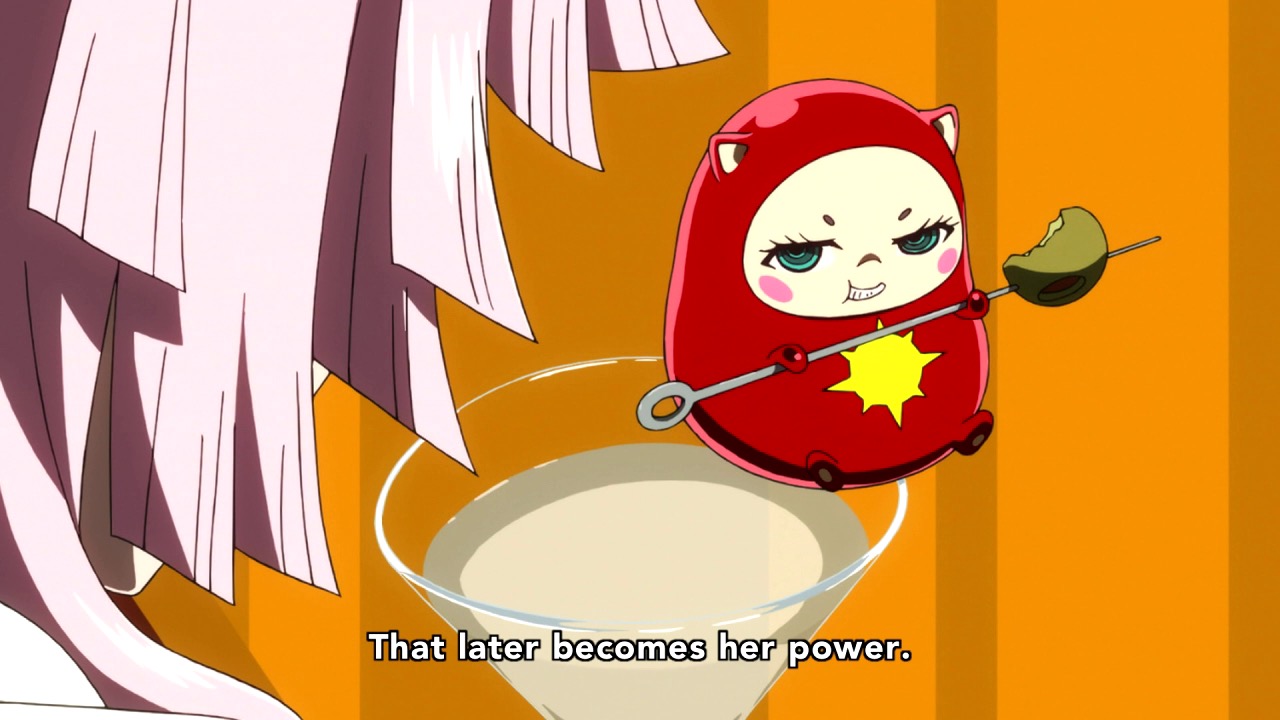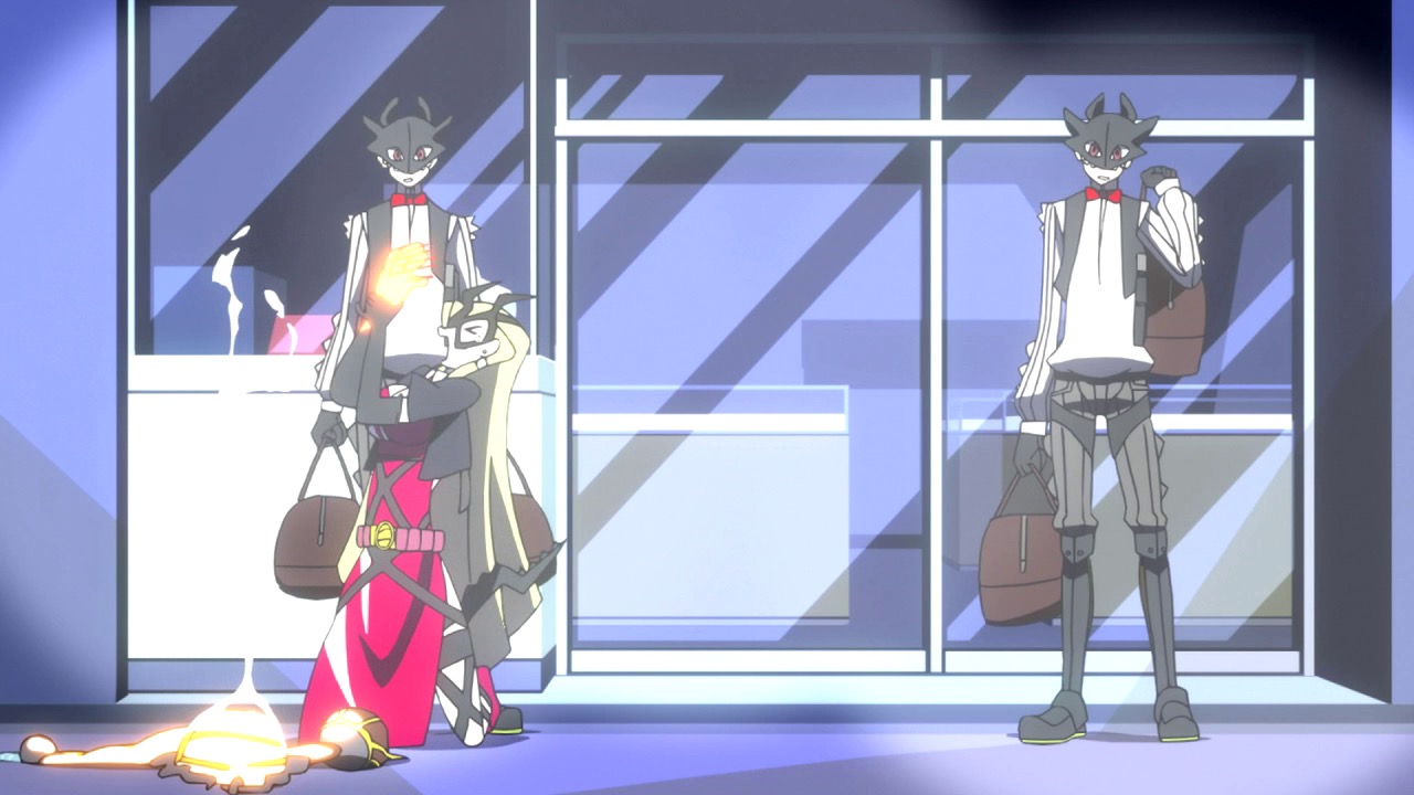 If there were any doubt as to the theme of Concrete Revolutio, Earth-chan personifies it to a ridiculous extent – her entire existence is conditioned on defining people as good or evil, and choosing the right side. As if there were any chance we could miss the point Mizushima beats us over the head with it hilariously, showing us Earth-chan saving baby birds and stopping sports cars so mother cats carrying kittens and old ladies can cross the street. But as we know, seeing true good and evil isn’t so easy, and Judas is a prime example of this. Essentially, when he says he wants to be good what he really wants is for good and evil to be easy things to understand – but alas, they’re not. And no amount of wishing can make it so.
