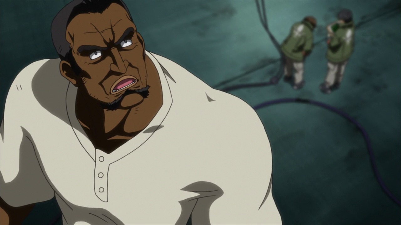 I think I missed Fareed McGillis here, too – he’s the most interesting of the antagonists we’ve met so far because he’s so hard to predict.  By contrast this week’s foes are pretty standard-issue – especially Maruba Arkay (who at one point is actually reduced to running in place and flailing his arms in fury).  Somewhat better is Naze Turbine (Toriumi Kousuke), captain of the Hammerhead – the ship that intercepts the Tekkadan.  Naze is at least smart enough not to take a buffoon like Maruba seriously, but he’s pretty clearly a zaku – it’s his boss McMurdo Barriston, the leader of Teiwaz, that seems like the guy who’s going to be a real factor in the story.