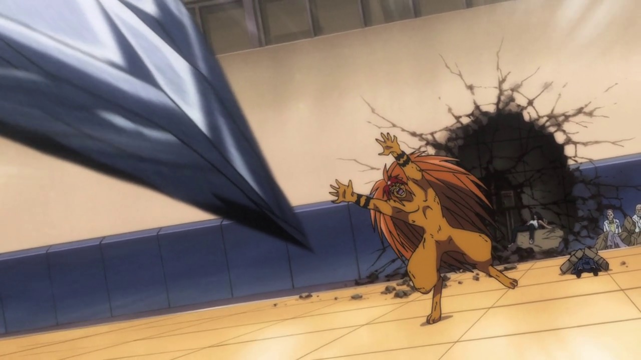 Certainly, “Alpha” Ushio and “Beta” Tora are the key to all this, though I obviously hope they don’t have to sacrifice themselves. Tora’s big moment in this episode comes not during the battle with Hakumen, but afterwards – when Ushio and Asako succumb to the poison gas it would be easy enough to flee on his own from the lab that’s about to be blown up to destroy the regenerating Hakumen, leaving the two of them (and Bal-chan, whom Ushio has managed to cut free) to die along with Helena. But of course that’s not the Tora we’ve come to know, and his status as one of the good guys is as firmly established as it could be by now. He even admits to Baldanders that as humans go, Ushio is “not bad”.