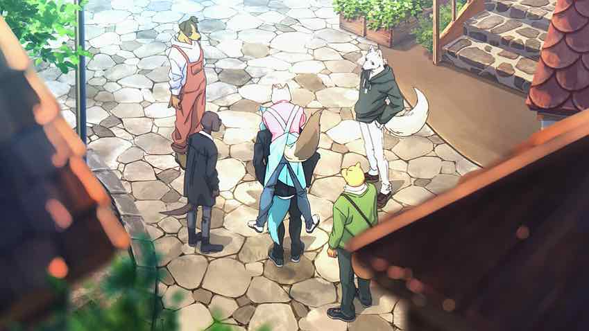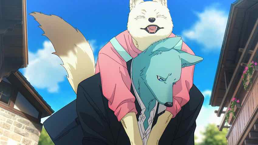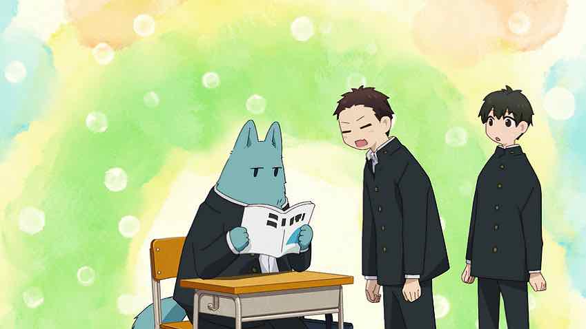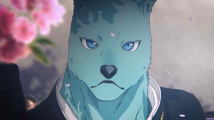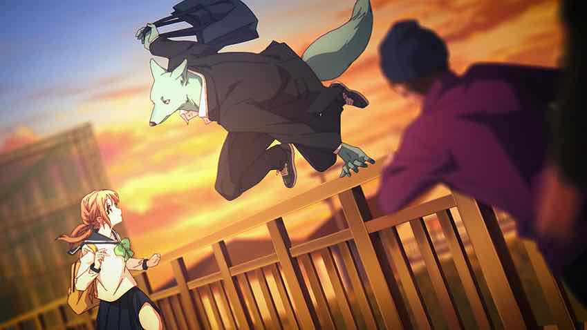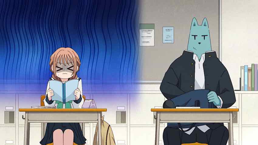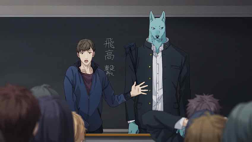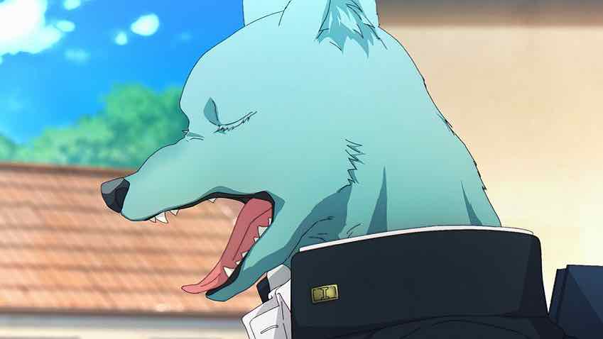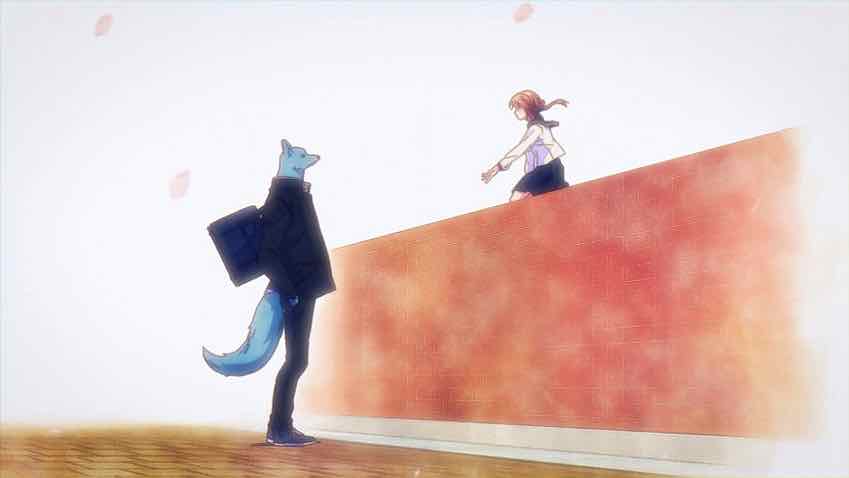 This info comes courtesy of a classic exposition by explanation cold open, which as LiA readers will know is a pet peeve of mine. That’s hardly an encouraging start, and generally speaking this premiere took a while to click for me. But it did, eventually. The themes of discrimination are painted in pretty broad strokes, but I quite liked the dynamic between Mari and male lead Hidaka Tsunagu (Eguchi Takuya). He is, as you’d guess, a beastman – in his case, visually a cross between human and dog (the OP/ED tell us there are other variants as well). He and Mari first interact when she’s jumping the school wall after arriving late, and he’s debating whether he can face a human school at all.
