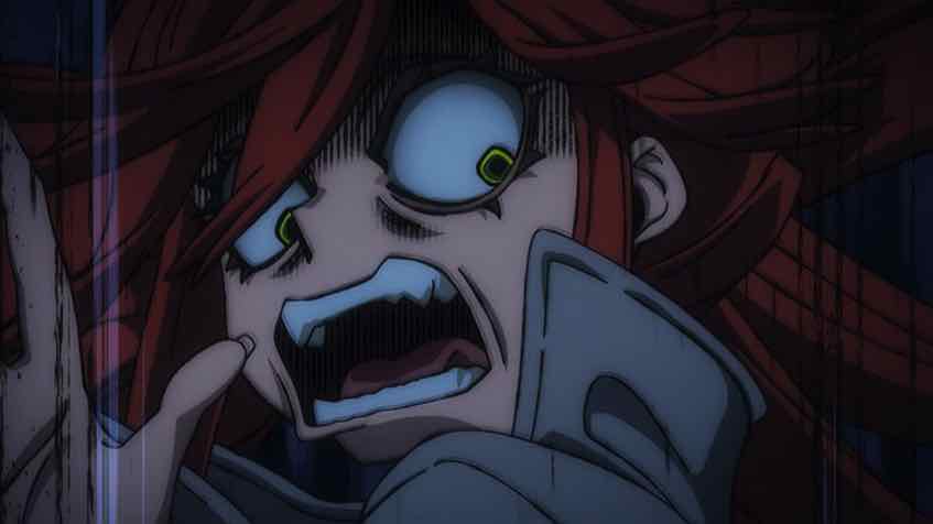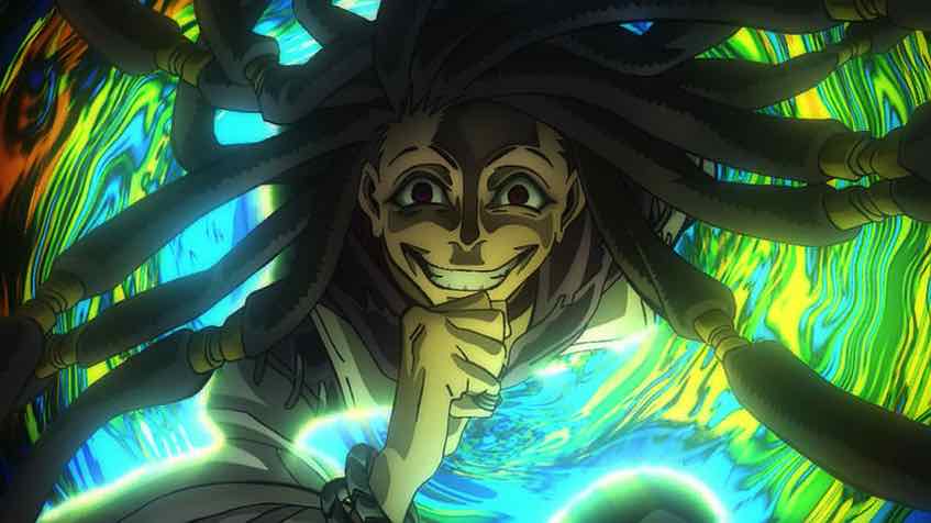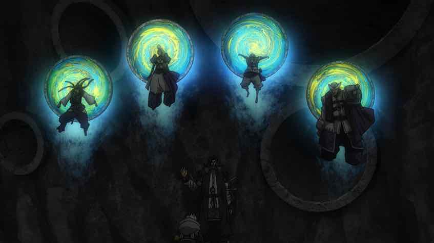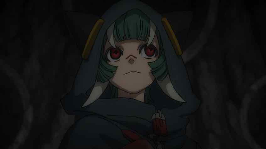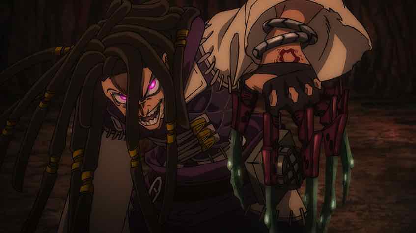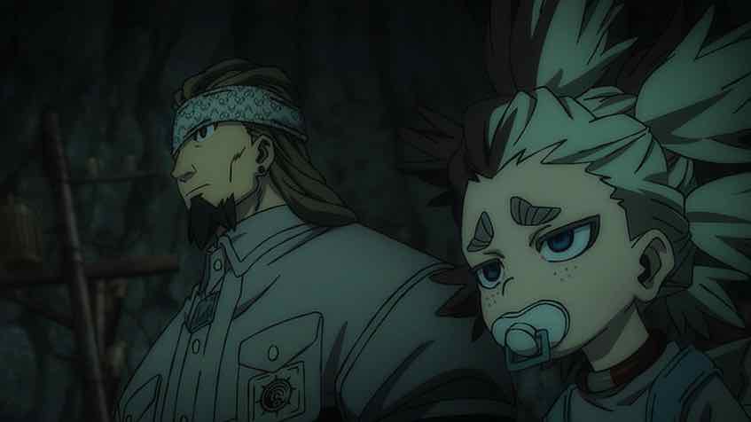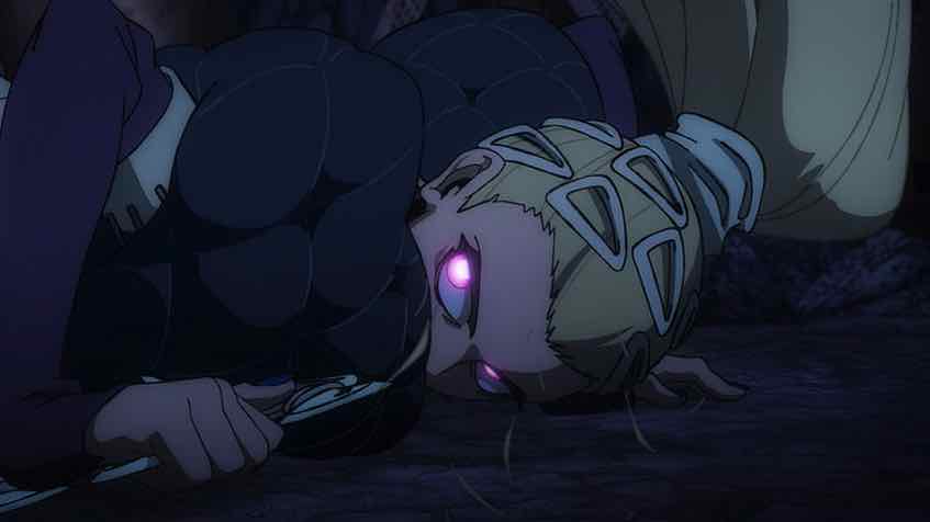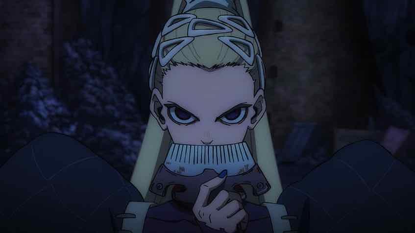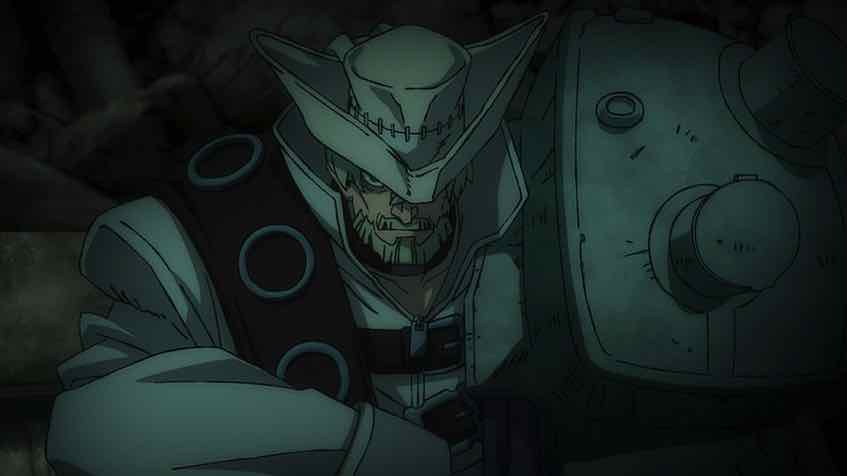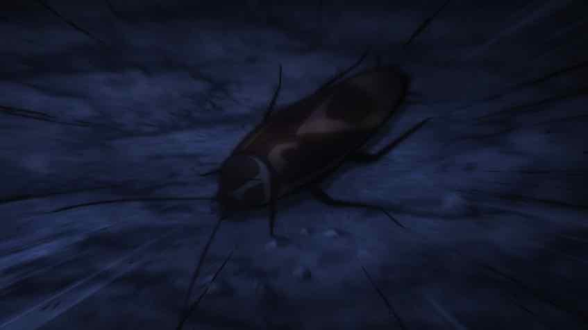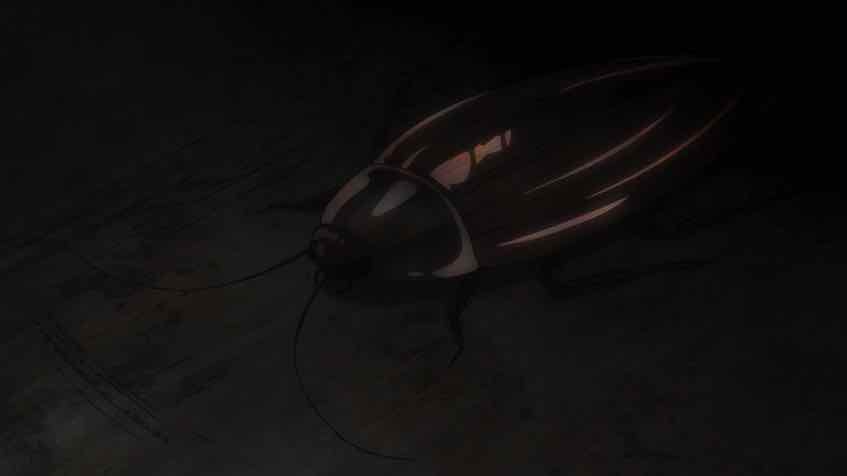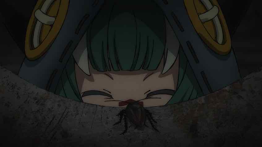 A familiar dynamic is rekindled as Zanka is reunited with Jabber Wonger (one suspects Jabber requested that). Enjin is paired off with a near-silent little fellow (Shimono Hiro) who hides behind a pile of trash as he watches him. Bro Santa and Dear Santa wind up with an older gent (Ohtsuka Akio) who confirms that this warren is indeed underground. Riyo ends up with a long-haired blonde lady named Noerde (Tamura Mutsumi) whose Jinki is almost certainly her comb. And a cockroach – uncensored, which is very rare (quite silly, that) for anime – which she’s surprisingly terrified of. Only Guita Hebby Fantasia appears to be alone – apart again from a roach, but she seems perfectly fine with that.