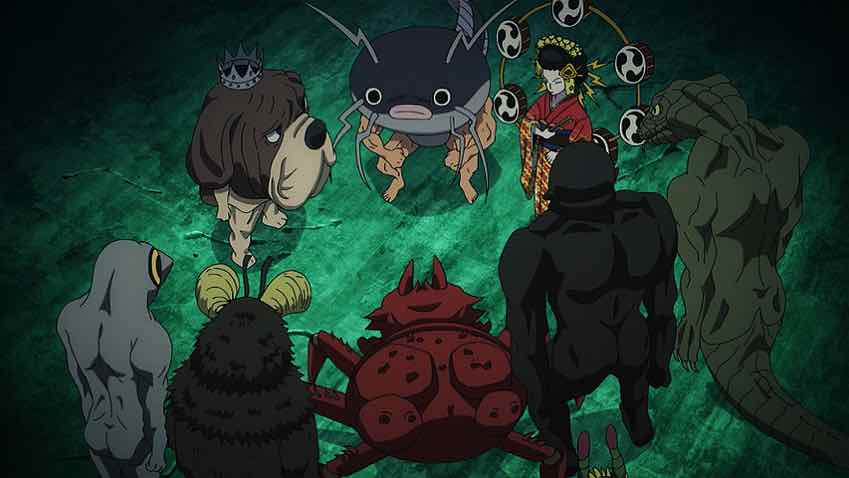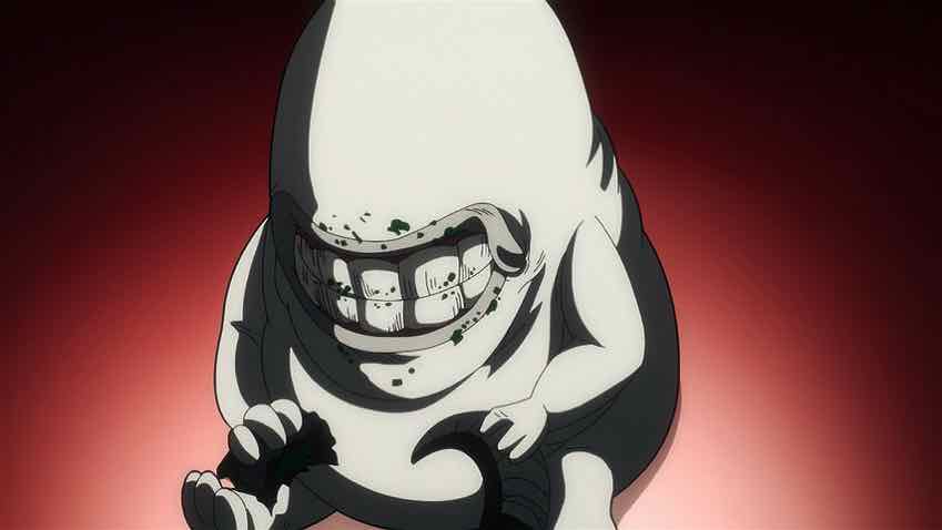 As for Garou, he seems to be holding his own against King the Ripper and Insect God until a third monster – Sludge Jellyfish – shows up. He’s got Tareo and a personal grudge against Garou (the nature of which I don’t remember) in tow. The three of them are seemingly too much for Garou and it’s Ripper that does most of the damage, which the monsters assume to be fatal. They drag Tareo off to Monster HQ for Ripper to play with at his leisure, but have to explain to the boss why Garou is dead when he was supposed to be taken alive.