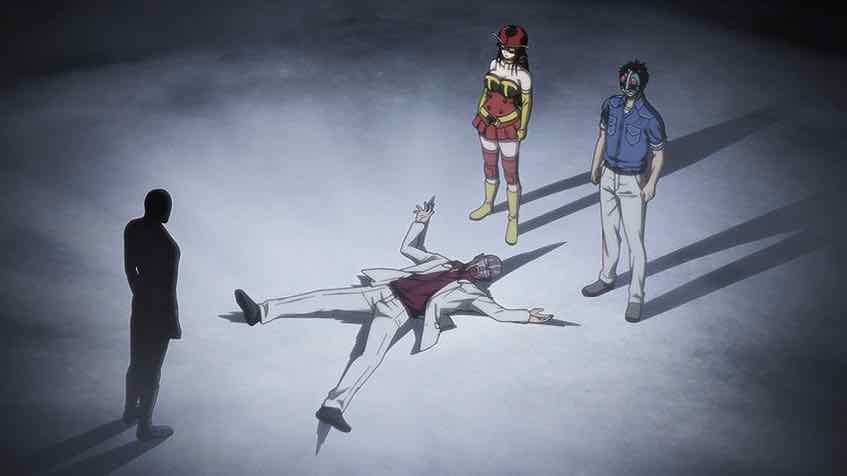 But the devil is in the details I suppose, and execution is everything. Samurai Flamenco resolutely failed to pull it off (for me) but that’s not to say Toujima Tanzaburou can’t. And the truth is, even after the twist I found this episode robustly entertaining. Its full-throated embrace of the crazy was effective, and the fact that pretty much every character is at least a few cards short of a full deck gives the whole experience a heady unpredictability. Shocker is real? Sure, why not. For Toujima, Shocker being real is like a gift from Heaven – a validation of all his dysfunctions. Yuriko – despite more thoroughly immersing herself in the illusion – has more reservations about all this. You sense he always believed the fantasy was real, and she was just embracing the fantasy.