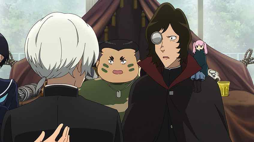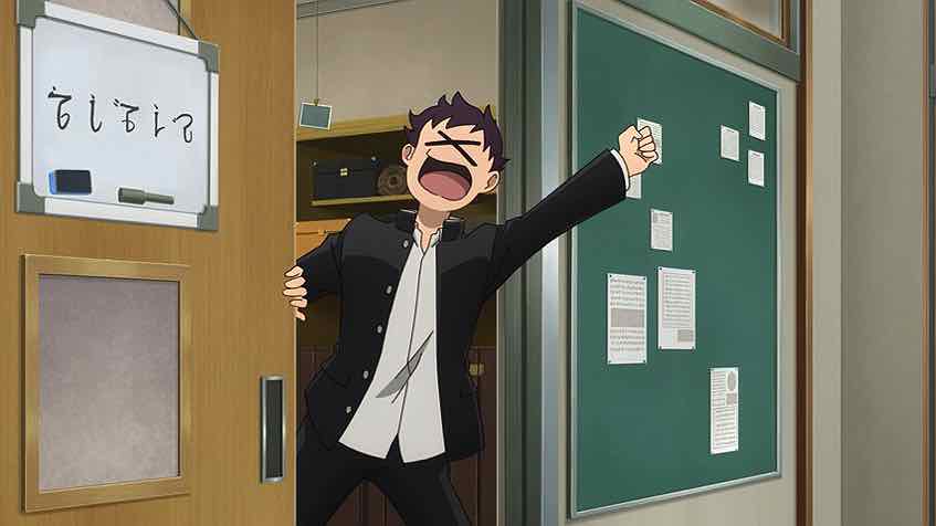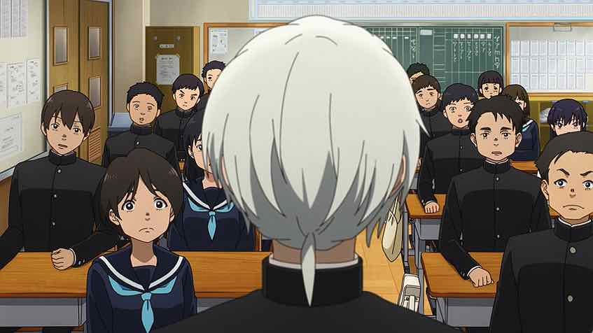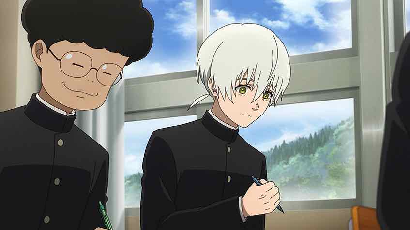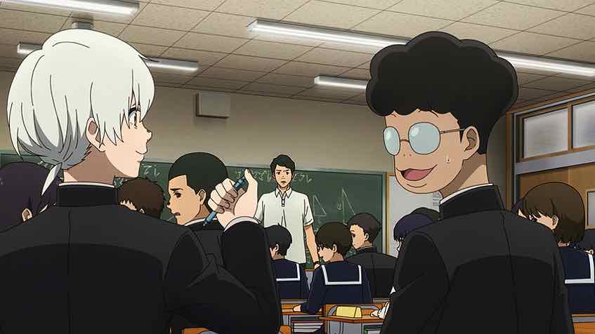 Even with that going on, the Fushigumi going to school is the basic theme of the episode. Gugu is in high school, where he says nobody asked him about the mask (which is hard to believe). Gramps is recommending home schooling for March and Eko. And the big dog is going to junior high (along with Tonari) – class 2-1 to be precise. Even though no one outside the occult nee handicrafts club knows his true nature Fushi is pretty damn exotic anyway, with his white hair and ignorance of things like mechanical pencils. He becomes quite a sensation, which makes his close relationship with Mizuha grist for the mill of the girls who despise her as a bitch (which is basically the Japanese equivalent of a slut).