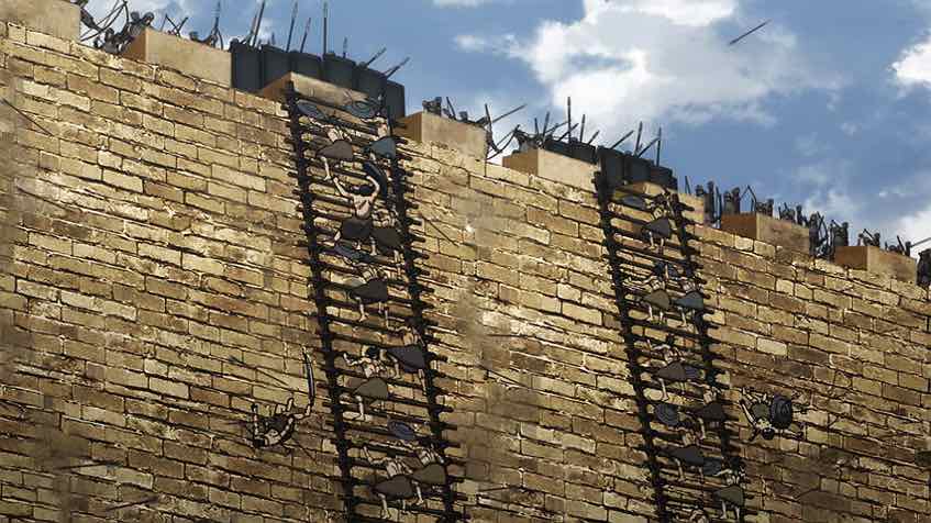 None of this is to say that the Fei Xin aren’t essential elements of this siege. Their main job is to overwhelm the defenders inside Liewei once the mountain tribes have opened the gates, but Yang needs their support in getting that done. As a very envious Wang Ben races towards Liewei to see for himself what happens and Meng Tian wistfully looks on, Xin despatches his “Bow Brothers” to support the tribesmen storming the walls. This is a worry, Xin says, because for all their skill Ben and Dan have never used their arrows on human beings before.