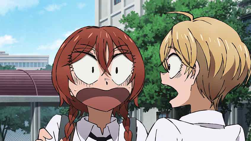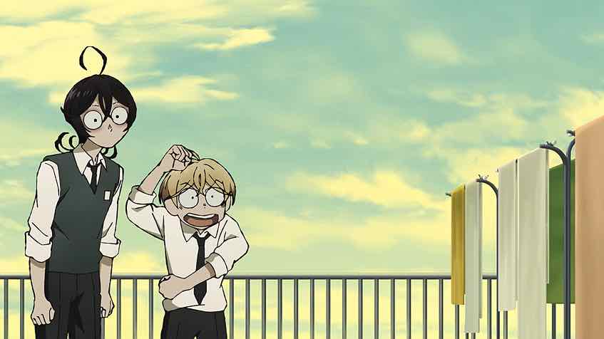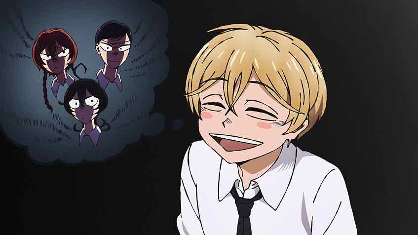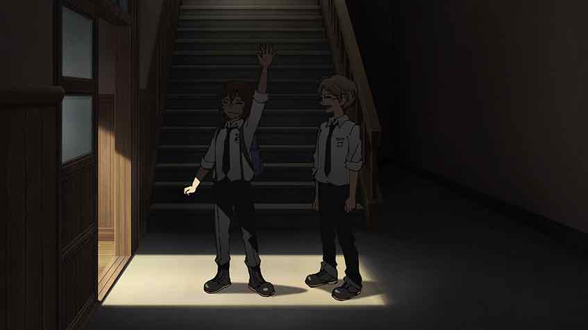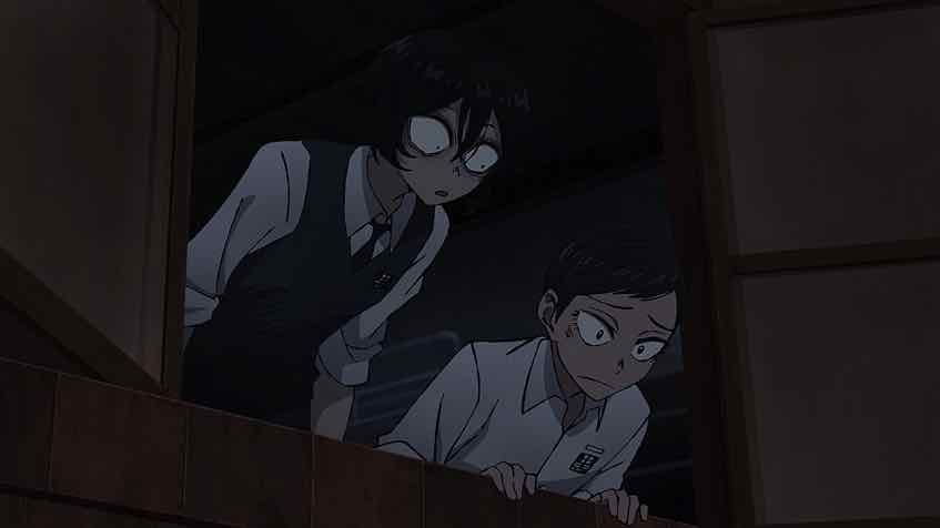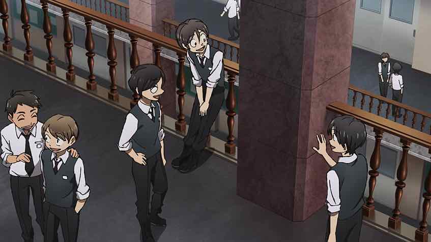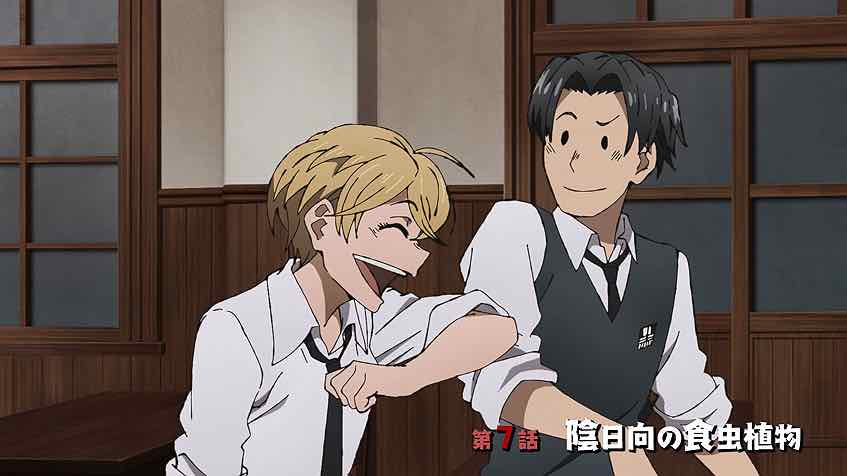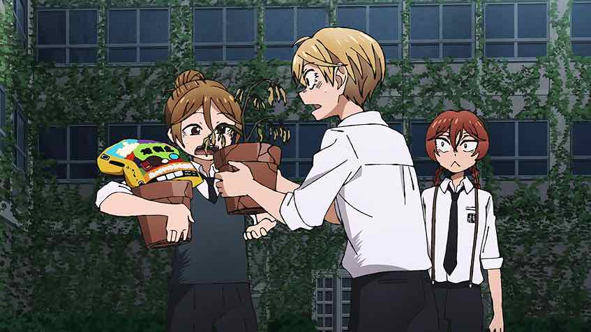 That’s only the appetizer though, as things are about to get really dark. That comes with the introduction of Namatame-san, a second-year who Sanda and Nico wind up helping carry some potted plants back to their classroom. That they were intentionally put outside in the middle of a typhoon is the first clue that something is seriously amiss, but Sanda and Nico don’t realize just how amiss until they arrive at Namatame’s classroom – Class 2-10, in the sub-basement. Sanda protests that the second-years only have five classes, but this one is clearly special.