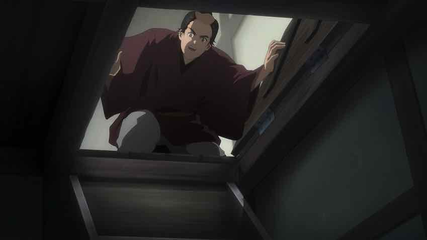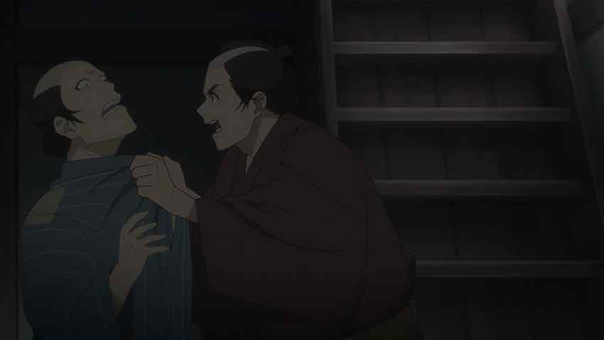 Superficially, it seems as if the murder mystery hatched in the first episode was resolved this week. Chougorou, the guy seemingly responsible, shows up at the shop (while Ichitarou is minding it) demanding the “rare drugs”. Ichitarou is nothing if not honest, and he believes that the mummy thing is a hoax. He tries to talk Chougorou out of wasting his money on it but Nikichi urges him to sell the drug anyway, as the customer seems highly volatile. That’s not the half of it – in the secret storeroom he knocks Nikichi out and turns on the young master when he realises mummy “smells all wrong”.