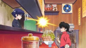This week happily focused on one of the two main triangles (Ranma-Akane-Ryouga being the other), while giving Soun a big supporting role. All that is pure win. The dojo sign has been taken, which means an official challenge has been issued. This is a scam cooked up by Soun and Genma to get Akane and Ranma to fight together – though eventually a real challenger shows up (way up) to throw a spanner into the works. Meanwhile Shampoo has cooked up a plan to entice Ranma into a date in exchange for the “Spring of Drowned Man Mix”, which has the power to turn him (or Genma, or a dog) into a normal man again.