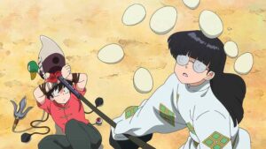 Beyond that, of course we got our fair share of signature Rumiko screwball comedy here: Mousse dropping in on the bike, the wedding, the exploding eggs (duck eggs?), Ryouga’s omiyage froom the wrong prefecture. That’s the bread and butter of Ranma ½ of course, which is why it so perfectly fills the Witch Watch slot on the schedule (which perfectly filled the Ranma slot – hopscotch would be fine with me, but next season they’re both off, sadly). It’s a great show to finish the week on. I’ll always be partial to InuYasha where Rumiko’s shounen oeuvre is concerned, but among her comedies Ranma ½ has the most charm. Here’s hoping the next round of it comes sooner rather than later.