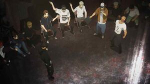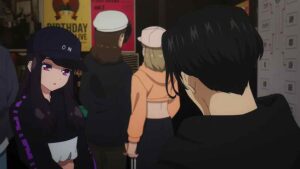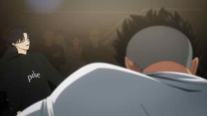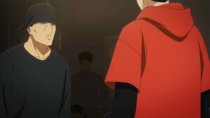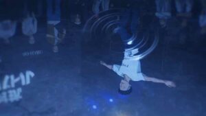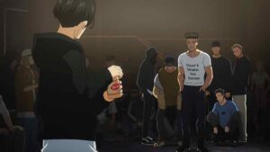 Kabo longs to comfort Wanda after her loss, but naturally hesitates, and it’s On-sempai who steps in. Wanda will be fine – she’s 15, a tear or two is no sign of crisis. Next up Usen faces off with Iori, not for the last time one suspects. This starts off with Usen’s crew staring Iori down, only to have Wanda and Kabo (adorably) step in to fire faggers back at them. You get that the mutual respect here is very real – and very much merited. These guys are good, very good. Usen specializes in hip-hop and the first tune favors him. The second is house (I assume the DJ does this intentionally to level the playing field (dance floor). But Usen sticks to his vibe – he just dials it up to eleven.