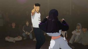 Watching this duo go at it is utterly fascinating. The dancing looks great first of all – and I mean the animation. We even get real facial expressions. But they’re just so distinct, these two. Iori’s dancing continues to appeal to me the most in aesthetic terms. He never seems to be trying too hard – he just flows. He’s relaxed, liquid. It may seem incongruous to recall Fred Astaire – a dance removed not just by an era, but several – when talking about a teenaged Japanese house dancer. But dancers are dancers – no matter the style or time, I think more unites than divides them. I’ve seen Astaire’s style described with “No matter how fast Astaire moves, he never seems to be working very hard.”, and I think that fits Iori like a glove.