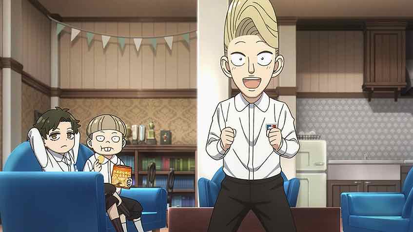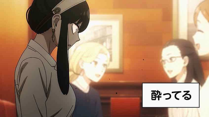 The business between Loid and Austin was kind of a throwaway, but I suppose the intent was to show him actually working as a psychiatrist as we don’t get to see that very often. I’m not sure his advice to Austin-sensei was especially helpful – “flee like the wind” would probably be more clinically effective. But at least he was trying. Yor getting drunk with her co-workers was likewise forgettably inoffensive, though I always wonder how it is someone living a secret life could allow themselves to get publicly drunk like that. But then Yor’s third of the story has always made the least sense anyway.